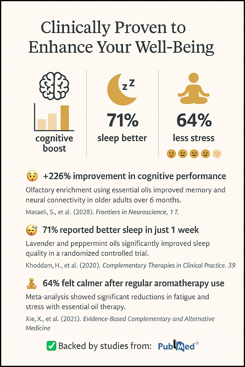 Xie, X. et al. (2021). Effects of aromatherapy on fatigue and stress in adults: A meta-analysis.Evidence-Based Complementary and Alternative Medicine, 2021, Article ID 9925945.Masaeli, S., et al. (2023)